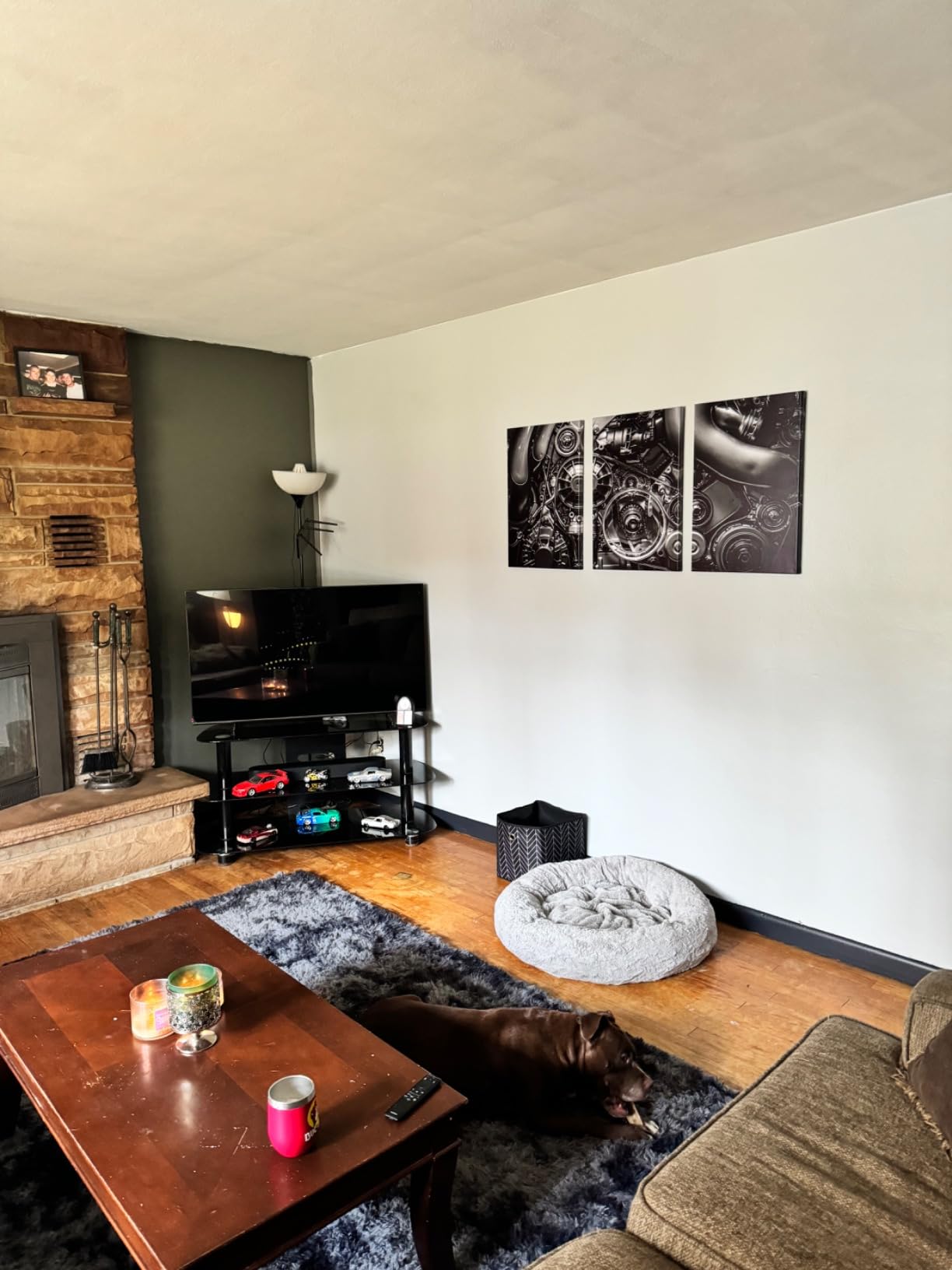This three-panel canvas set creates an immediate focal point in any automotive space. I mounted mine on the main garage wall where it dominates the room with a dramatic close-up of engine gears and chains. The total 48×24 inch spread commands attention without being overwhelming.